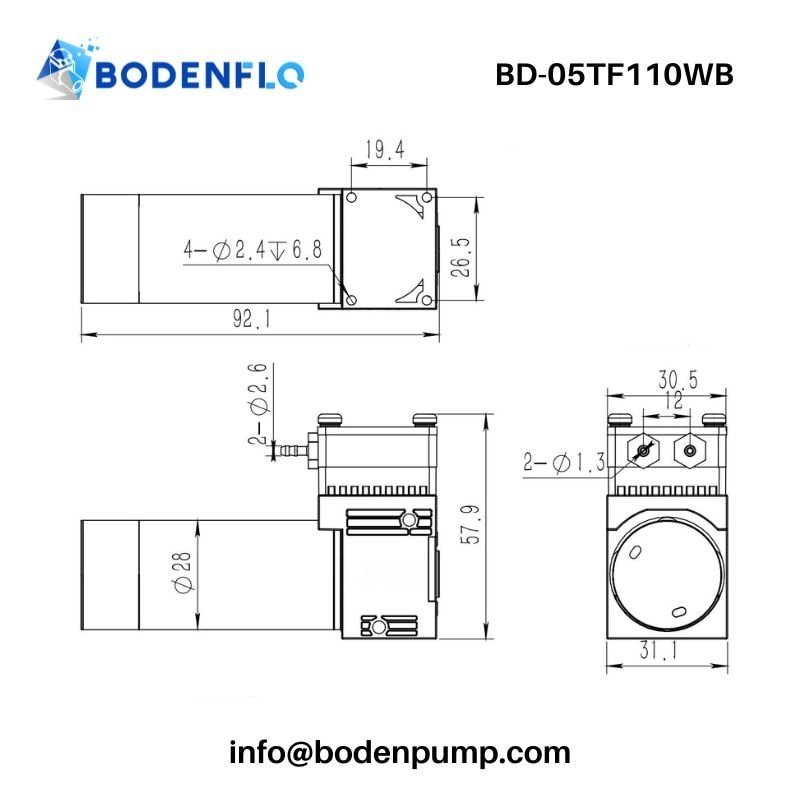 The BD-05TF110WB is a small liquid pump engineered for OEM inkjet systems, analytical instruments, and compact fluid dosing modules that require precise micro-flow control and long service life. Its diaphragm pumping structure ensures oil-free fluid handling and supports stable self-priming performance in compact pipeline layouts.